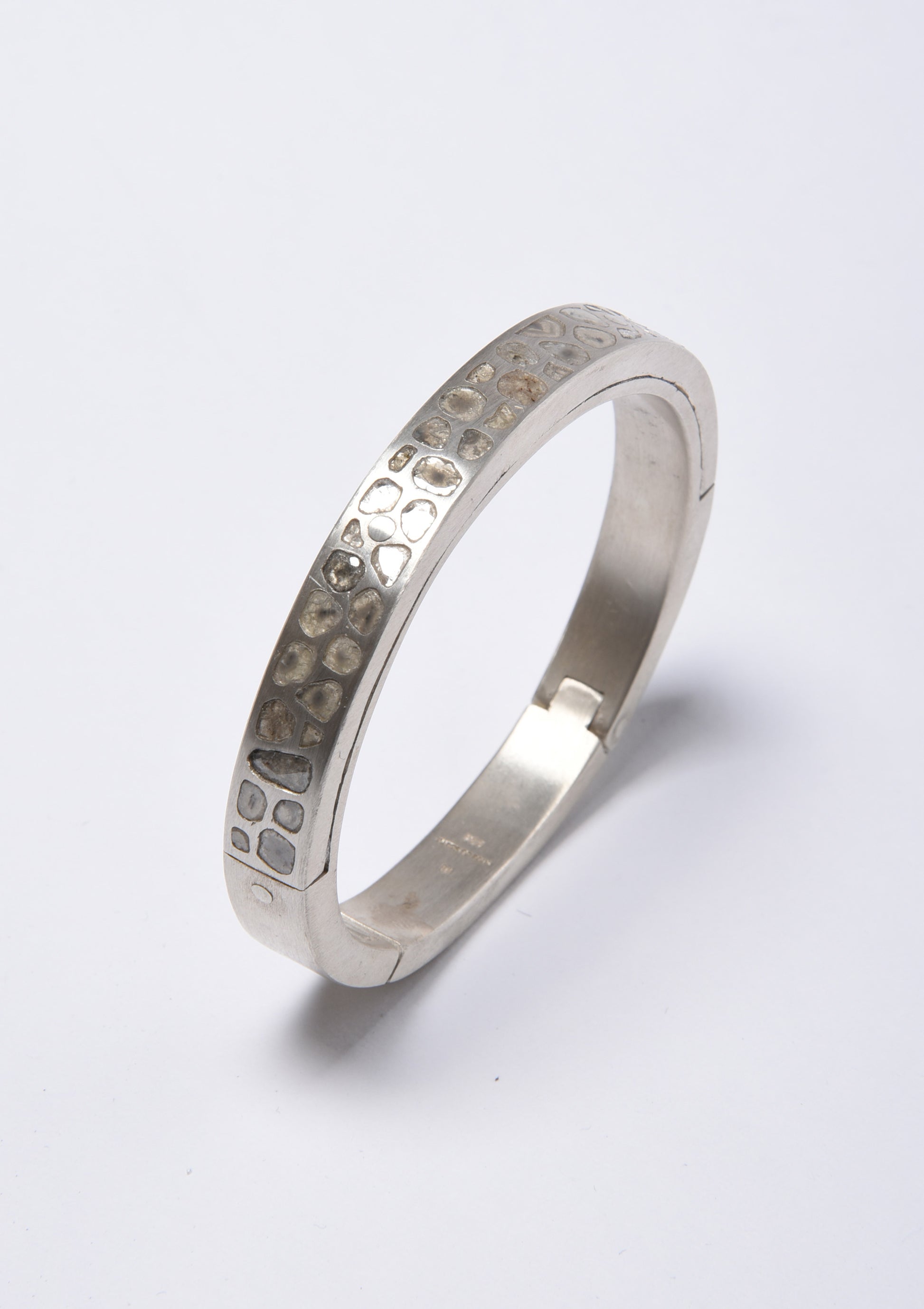 The stones used in this item are slivers of diamond material that are removed from a larger chunk of diamond as they are attempting to get to the perfect diamond in the center. Each stone fragment and shape are absolutely unique. The image you see in this photograph is one example, every piece will be unique as determined by the stones.